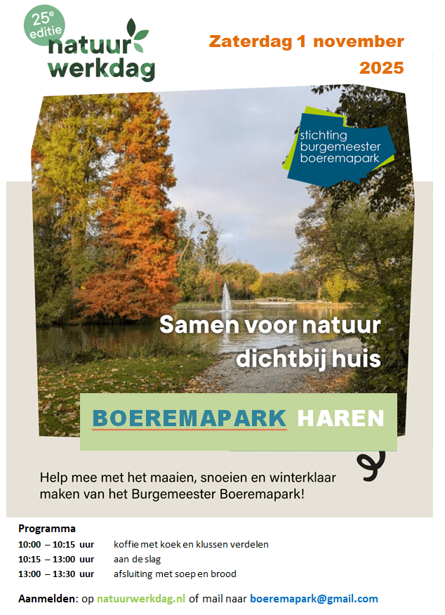Afgelopen zaterdag 1 november gingen ruim 30 vrijwilligers tijdens de Natuurwerkdag aan de slag in het Boeremapark, onder het motto “Samen voor natuur dichtbij huis”. De dag begon droog, maar rond 11 uur begon het langdurig te regenen en werd het kleddernat. Maar de vrijwilligers lieten zich hierdoor niet uit het veld slaan en gingen stug door met de klussen die op het programma stonden. Ondanks de slechte weersomstandigheden is er toch weer veel werk verzet en is het resultaat goed zichtbaar. Petje af voor de vrijwilligers van afgelopen zaterdag! Gelukkig werd het tegen lunchtijd weer droog en konden de deelnemers afsluitend genieten van een warm kop soep met belegde broodjes.