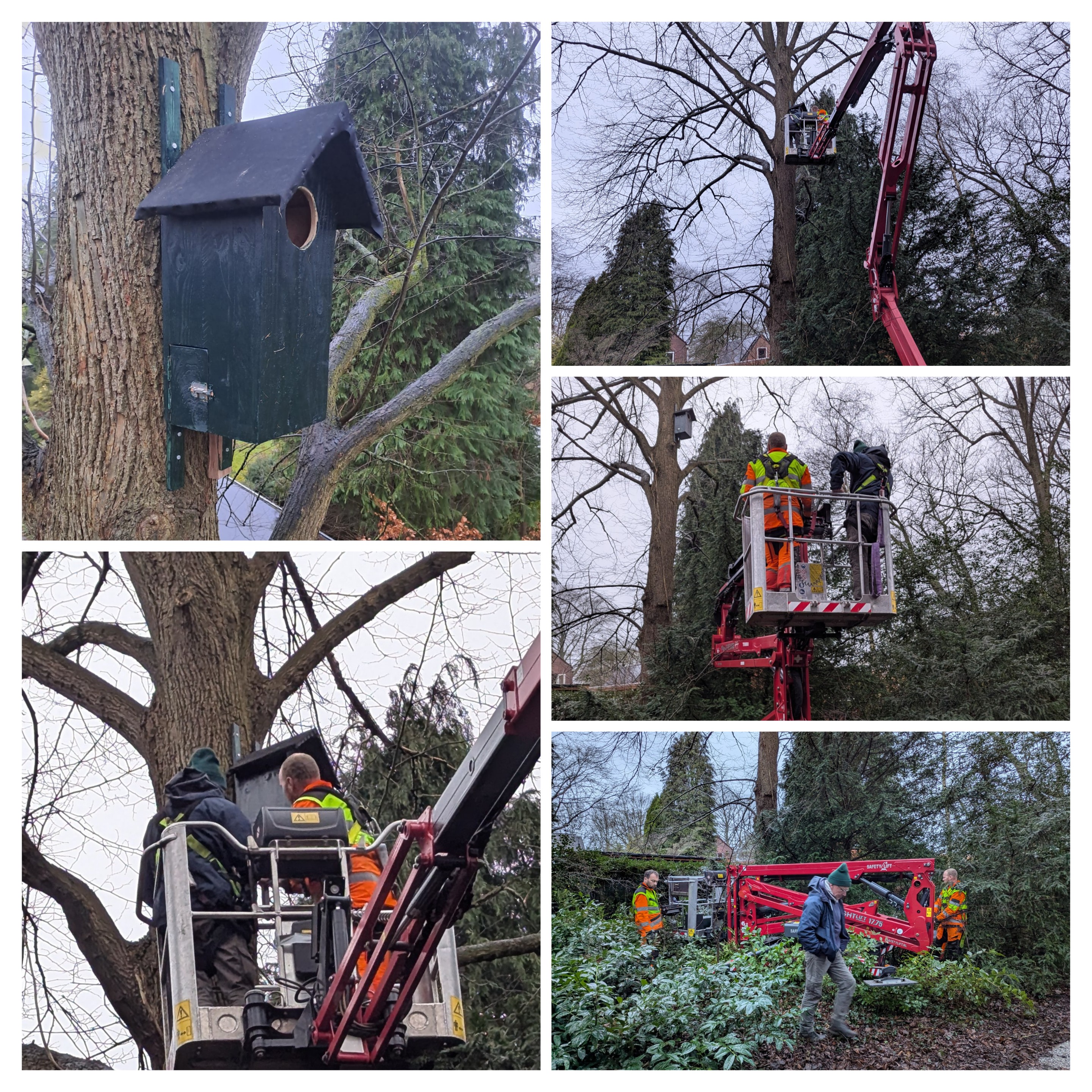 Misschien hoort u ze wel eens ’s avonds in of rond het park: bosuilen. Je ziet ze bijna nooit, maar ze zijn er wel degelijk. Hun kenmerkende roep verraad hun aanwezigheid. Om ook in het Boeremapark een mogelijkheid te bieden om te nestelen, hebben we vrijdag 19 december een nestkast voor bosuilen geplaatst. Daarbij kregen we professionele hulp van de gemeente in de vorm van een hoogwerker en twee boomspecialisten.
