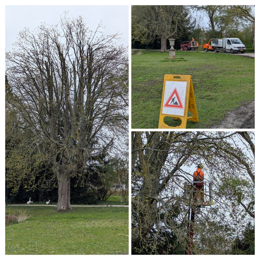 Afgelopen maandag 13 april gingen de bomenexperts voorzichtig aan de slag met de monumentale kastanjeboom in het park. Het afval werd meteen vakkundig opgeruimd, met het oog op het besmettingsrisico. De ingreep bleek uiteindelijk beperkt. De boom heeft gelukkig z’n uitstraling behouden. We zijn erg blij met het resultaat en hopen dat de boom met deze ingreep nog heel lang behouden kan blijven.