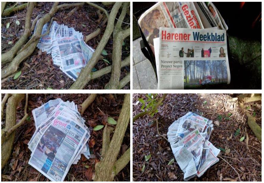 Het is lang goed gegaan, maar vanochtend werden we weer eens geconfronteerd met een partij gedumpte kranten. Onder de Rhododendrons in de noordoosthoek van het park lagen stapels Harener Weekbladen, Groninger Gezinsbodes en Groot Groningen. We hebben de rommel opgeruimd en de verantwoordelijk uitgevers (NDC Media en Media Totaal) aangeschreven.