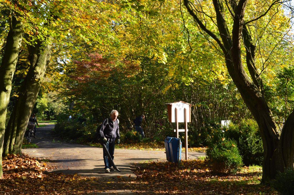 Afgelopen zaterdag 1 november deed het Boeremapark voor de tweede keer mee aan de nationale Natuurwerkdag. Rond 10:00 uur verzamelden zich circa 25 enthousiaste vrijwilligers in een zonovergoten Boeremapark met prachtige herfstkleuren. Na de traditionele koffie met deze keer warme appelkruimeltaart en slagroom van Pieter Dijkema (Culinaire Zaken) werd er flink aangepakt. Er stonden twee grote klussen op het programma: het opnieuw inplanten van de entree aan de Parkweg en het snoeien van zaailingen van de Vleugelnoten bij het hertenkamp. Daarnaast werd het park weer bevrijd van het nodige zwerfvuil, werd onkruid tussen de stenen verwijderd en werd in het hele park blad geblazen. Er werd in ruim twee en een halve uur weer enorm veel werk verzet. De manshoge stapel snoeiafval is stille getuige van de geweldige inzet.