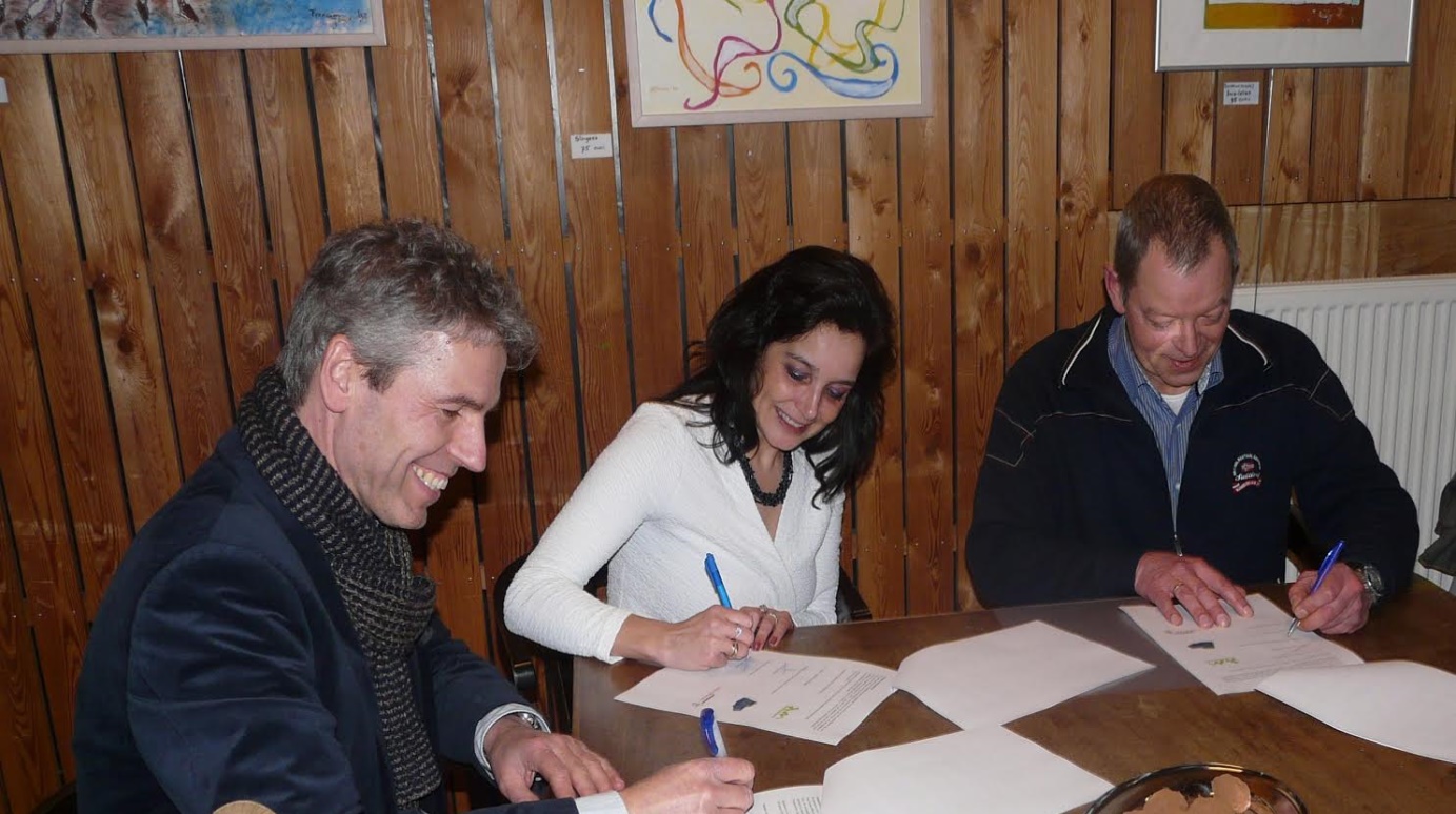 Geert Nader (Mikkelhorst), wethouder Mariska Sloot en Cor Harms (St. Burg. Boeremapark) ondertekenen de nieuwe overeenkomst