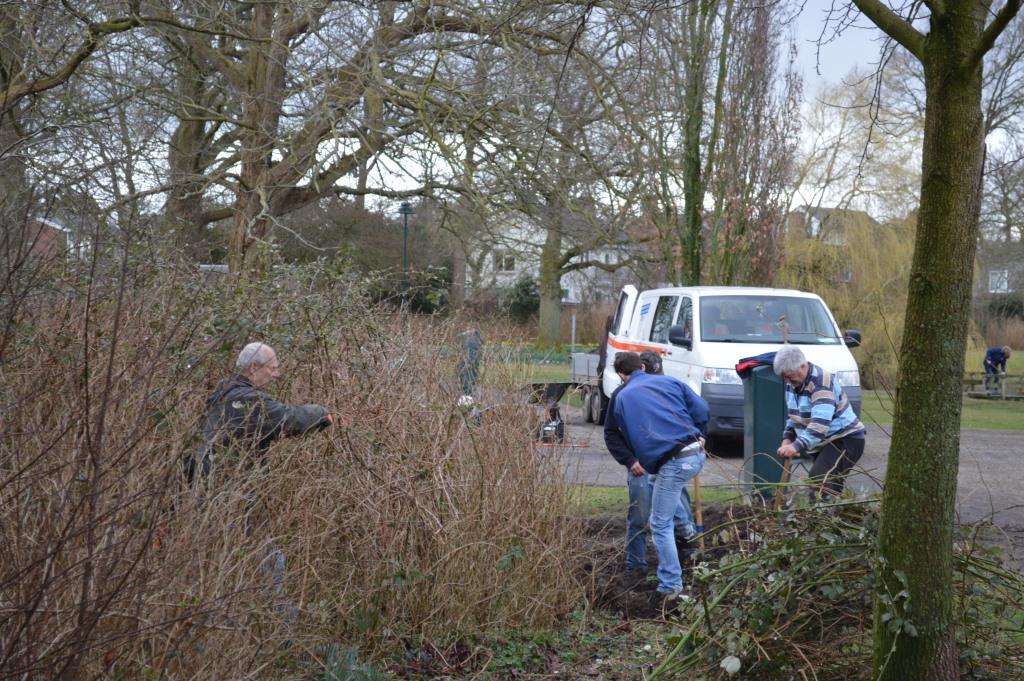 Gewapend met emmers sop werden de afvalbakken en bankjes in het park gereinigd. De afvalbakken worden binnenkort voorzien van stickers met het verzoek hondenpoep op te ruimen. Op diverse plekken werd weer braam verwijderd en gesnoeid. De hoeveelheid zwerfaval leek deze keer mee te vallen, maar er werden toch nog vier vuilniszakken rommel uit het park gevist. Daarbij kwamen de gekste dingen voor de dag, zoals een toilettas met de nodige inhoud. Tot slot werden op diverse plekken gaten in het grasveld en rijsporen gevuld en ingezaaid met gras.