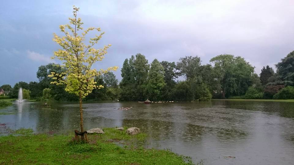 Als gevolg van de stevige buien trad de vijver in het Boeremapark buiten z’n oevers en moesten de laarzen aan om een rondje park te doen.