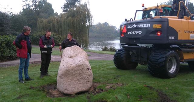 Jan Louwes (links) bij het plaatsen van de zwerfkei in het park (oktober 2016)