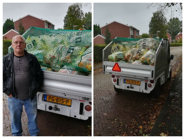 Afgelopen donderdag 5 oktober zijn we in samenwerking met de Mikkelhorst begonnen met het inzamelen van plasticafval aan de Parkweg. Ondanks het regen- en stormachtige weer werd op de eerste dat meteen een wagen vol plasticafval ingezameld. Helaas kon Harm Jan niet komen vanwege autopech, maar dat werd goed opgevangen door z’n collega’s van de Mikkelhorst.