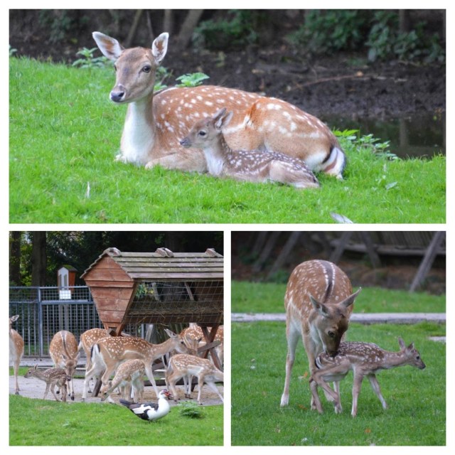 De hertenfamilie heeft er weer een telg bij. Vanmiddag werd het vierde jong van dit jaar geboren. Hinde en kalf maken het uitstekend. De kleine maakte meteen kennis met de rest van de familie.