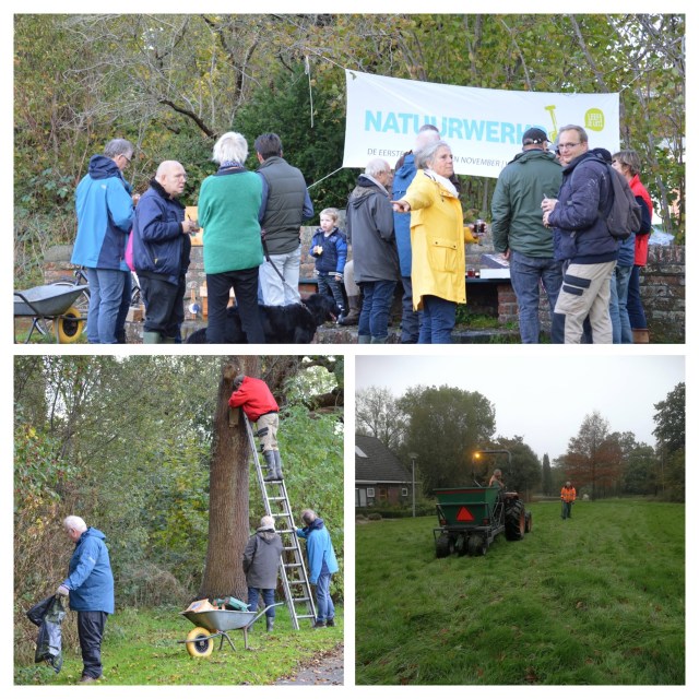 De dag na deze inleidende actie begon de Natuurwerkdag als vanouds met koffie en cake bij de Burgemeester Boeremabank en de verdeling van de klussen. Er waren weer veel trouwe deelnemers van de partij, maar ook een aantal nieuwe gezichten. Het was weer een gevarieerd gezelschap, van jong tot oud. De jongste deelnemer was de vierjarige Ian, die samen met vader Ruurd dapper meedeed. Maar ook Caleigh en Lysanne hebben heel flink geholpen.