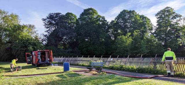 Vrijdagavond 22 mei kwam de brandweer in actie om te voorkomen dat de waterpartij in het hertenkamp droog zou vallen. Het waterpeil was door de droogte ver gezakt en de waterpartij dreigde in een modderpoel te veranderen. Hiermee werd voorkomen dat er dieren vast zouden komen te zitten in de modder. Dat overkwam vorig jaar de pauw, die toen ternauwernood kon worden gered. Brandweermannen bedankt voor jullie inzet!