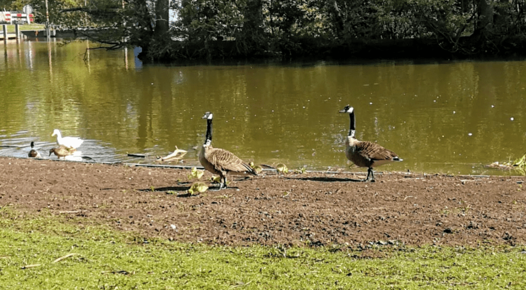 Afgelopen vrijdag 6 mei werden ze voor het eerst gespot: de eerste ganzenkuikens van dit jaar. Het zijn er zes en de ouders kijken waakzaam toe hoe het kleine grut de walkant afstruint. De werkzaamheden in het park waren in elk geval voor deze ganzen geen belemmering om er te broeden.
