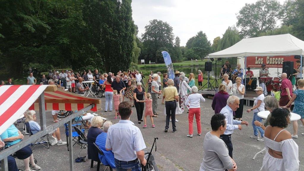 Er was zondagmiddag niet veel aansporing nodig om de beentjes van de grond te krijgen tijdens het zomerconcert in het Boeremapark. Ruim 100 bezoekers, jong en oud, genoten met volle teugen van een wervelend optreden van Los Cascos, de enige echte Nederlandse Latin-popband uit Groningen. Een zomers Boeremapark verkeerde die middag voor even in Latijns-Amerikaanse sferen.