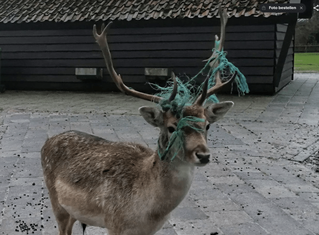 Sinds oudejaarsdag loopt de hertenbok in het Boeremapark met een stuk touw in z’n gewei. We hebben er sindsdien veel meldingen over gehad van bezorgde bezoekers van het park.