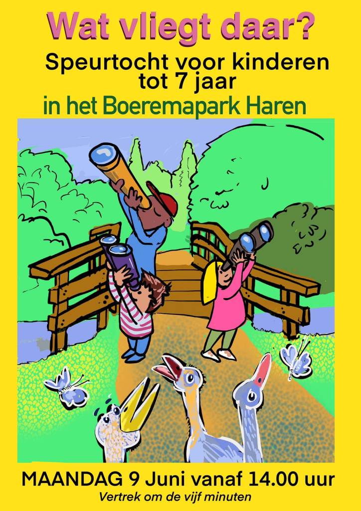 Op maandagmiddag 9 juni, 2e Pinksterdag, kunnen kinderen tot 7 jaar op zoek naar alles wat er zoal vliegt in het Boeremapark. De speurtocht start om 14:00 uur bij de grote burgemeester Boeremabank in het park.