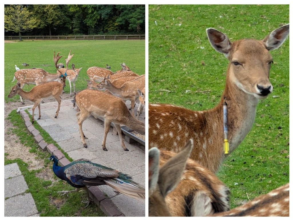 De volgende dag werd een nieuwe poging ondernomen, deze keer met een iets hogere dosering. Maar de roedel was nu extra alert en zelfs met voer niet te verleiden om dichterbij te komen. Uiteindelijk lukte het de bok met twee verdovingen onder narcose te brengen. Desondanks moest hij toch nog met 3 man onder bedwang worden gehouden om het prikkeldraad te kunnen verwijderen. Het draad zat strak om het gewei gewikkeld en moest met een tang in stukken worden geknipt. De bok had door het prikkeldraad wel wat kleine wondjes, maar niets ernstigs. De wondjes zijn meteen behandeld met een antibioticaspray. Dat zijn de groene vlekken die nu nog zijn te zien rond z’n gewei. Na de ‘verlossing’ was de bok nog lang versuft en is de hele avond in de gaten gehouden. Maar de volgende ochtend was hij weer present bij het voeren. De vrijwilligers die de herten verzorgen waren erg ongerust, maar gelukkig is het goed afgelopen en kijken we terug op twee enerverende dagen.