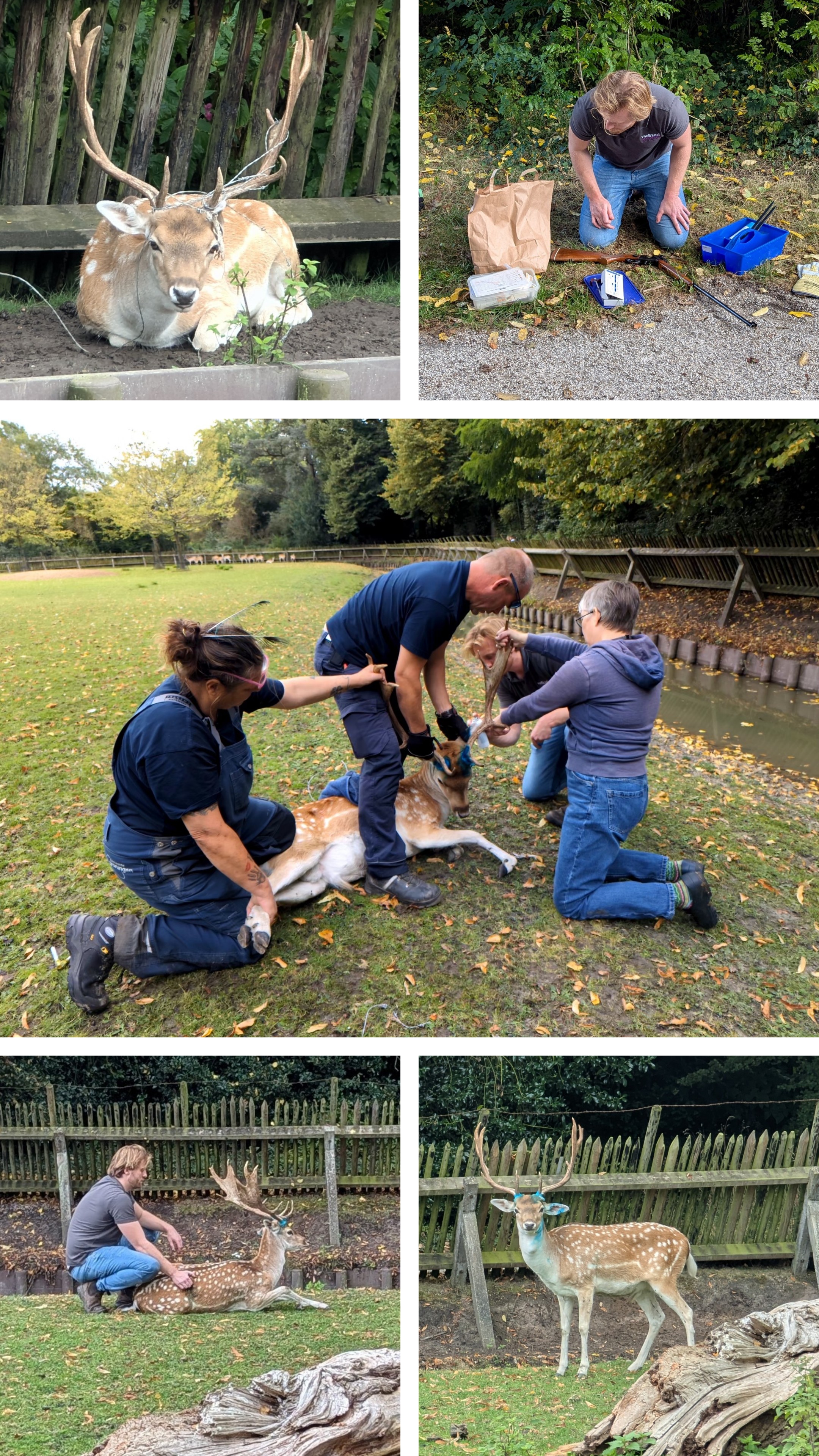 De volgende dag werd een nieuwe poging ondernomen, deze keer met een iets hogere dosering. Maar de roedel was nu extra alert en zelfs met voer niet te verleiden om dichterbij te komen. Uiteindelijk lukte het de bok met twee verdovingen onder narcose te brengen. Desondanks moest hij toch nog met 3 man onder bedwang worden gehouden om het prikkeldraad te kunnen verwijderen. Het draad zat strak om het gewei gewikkeld en moest met een tang in stukken worden geknipt. De bok had door het prikkeldraad wel wat kleine wondjes, maar niets ernstigs. De wondjes zijn meteen behandeld met een antibioticaspray. Dat zijn de groene vlekken die nu nog zijn te zien rond z’n gewei. Na de ‘verlossing’ was de bok nog lang versuft en is de hele avond in de gaten gehouden. Maar de volgende ochtend was hij weer present bij het voeren. De vrijwilligers die de herten verzorgen waren erg ongerust, maar gelukkig is het goed afgelopen en kijken we terug op twee enerverende dagen.