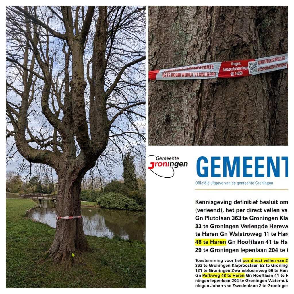 Tot onze grote schrik zat er vandaag ineens een rood-wit lint om de monumentale kastanjeboom in het Boeremapark. Hierop staat te lezen dat de boom wordt verwijderd in verband met de Kastanjeziekte. Uit het Gemeenteblad van 8 april blijkt dat er vergunning is verleend voor het ‘per direct vellen van 20 bomen‘, waaronder de beeldbepalende kastanjeboom in het Boeremapark.