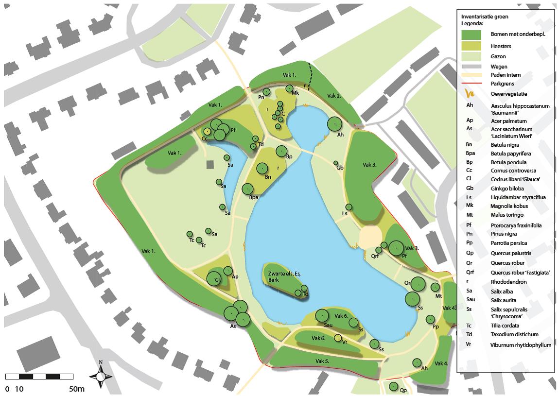 Klik op de kaart hieronder voor informatie over de locatie van boom- en heestersoorten in het park.